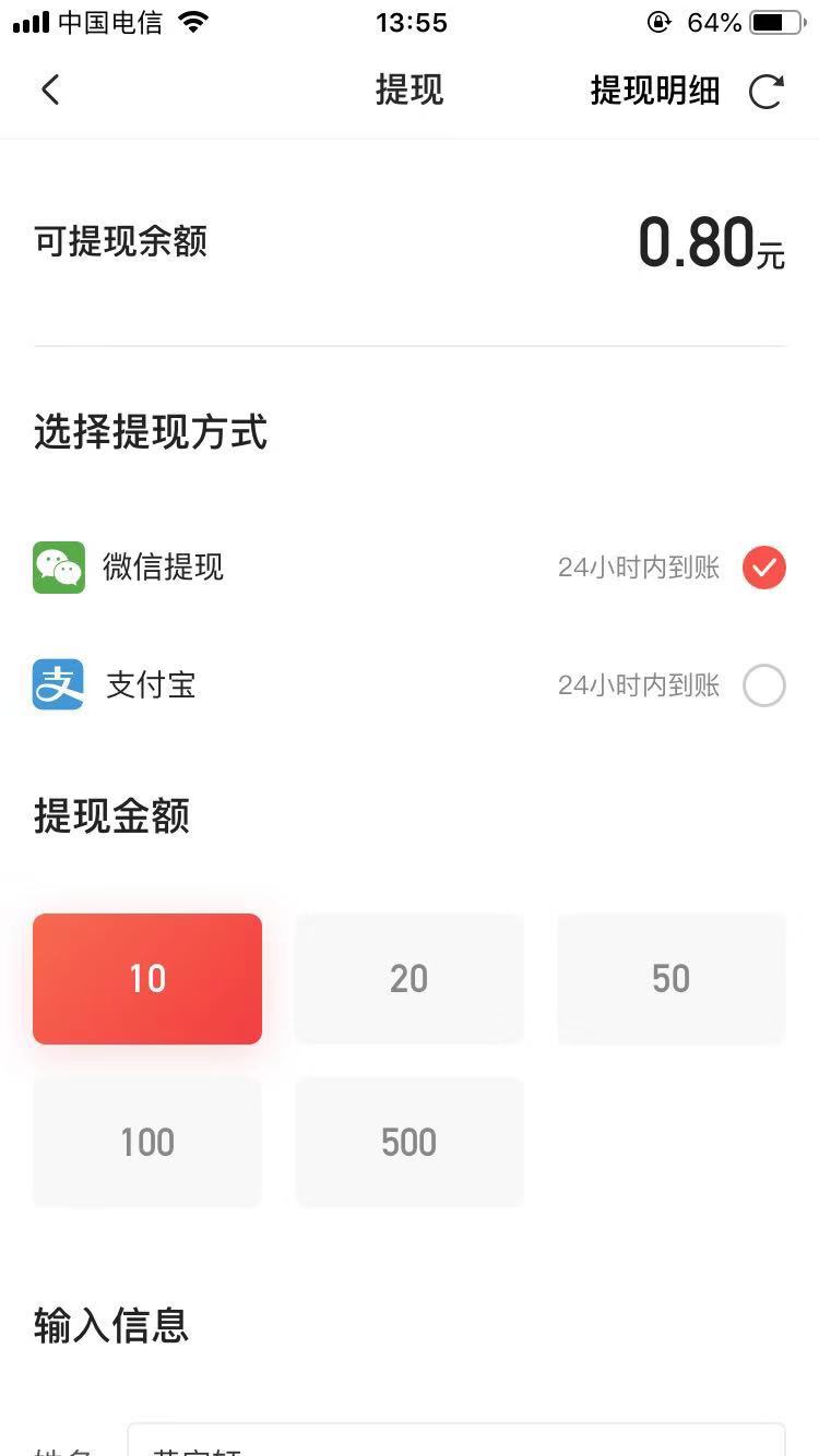 2、最低满10元即可申请提现,只需多赚7元就能提现啦